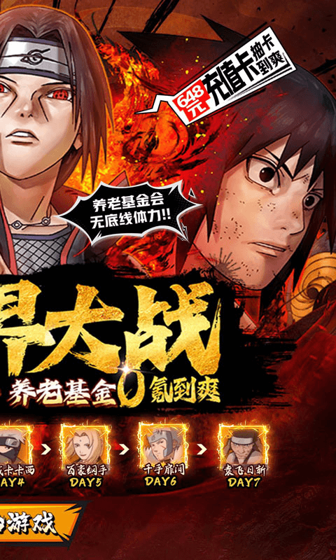 ★首续0.05折,充值比例1:10,开局送6个S级忍者自选!