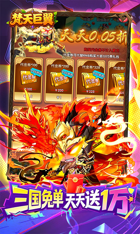 《梵天巨翼》是一款Q版国风题材的卡牌+塔防回合制游戏。你将化身主公,带领英雄们征战天下!烧脑策略秀操作,每个武将也都各具特色,趣味的玩法,休闲的画风,简单的操作,原创“满屏技能释放”,带来燃尽十足的战斗快感,每日福利拉满,永久0.05折,天天送10000代金券,让战斗在你的指尖生动重现。